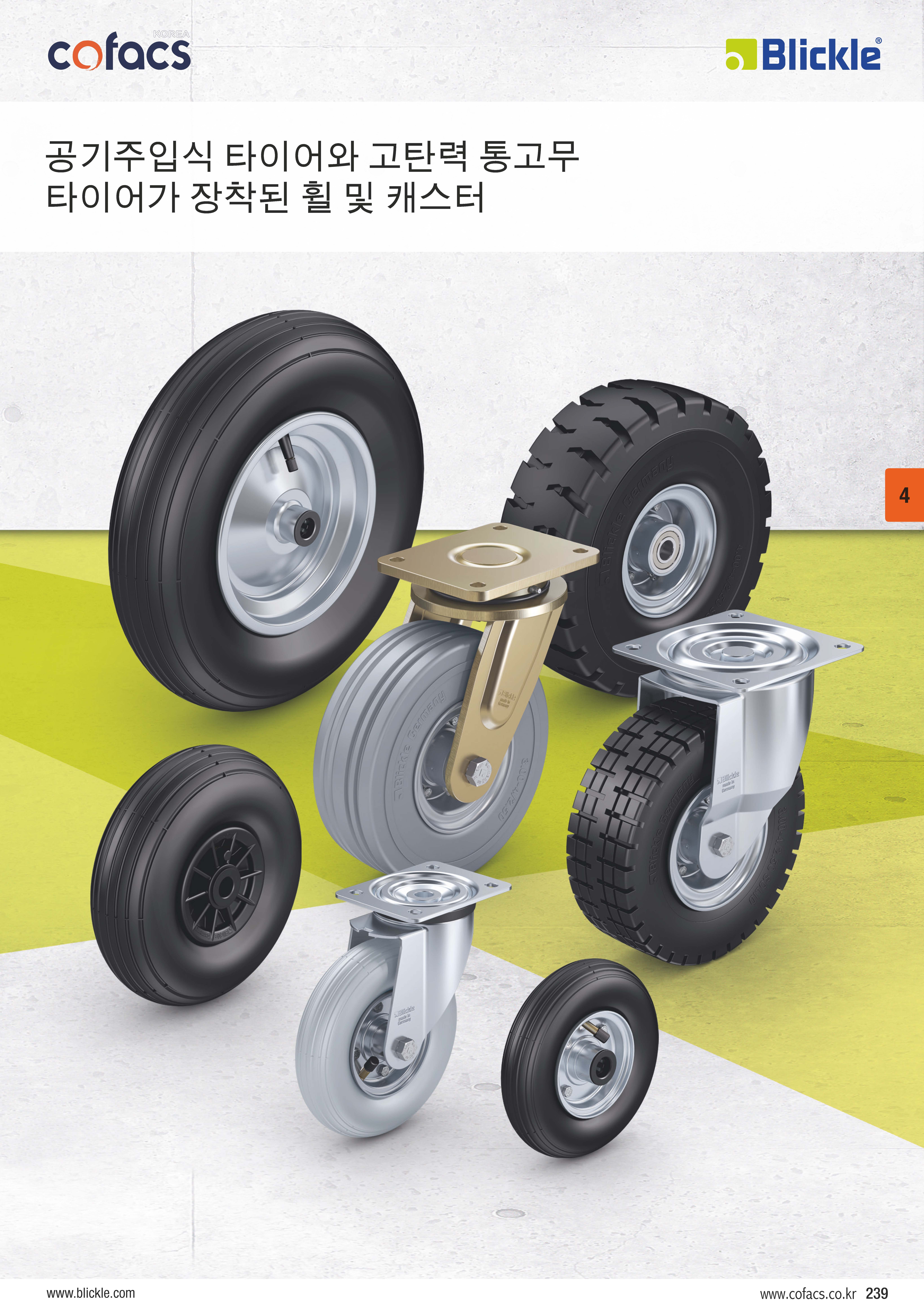 공기주입식 타이어와 고탄력 통고무 타이어가 장착된 휠 및 캐스터