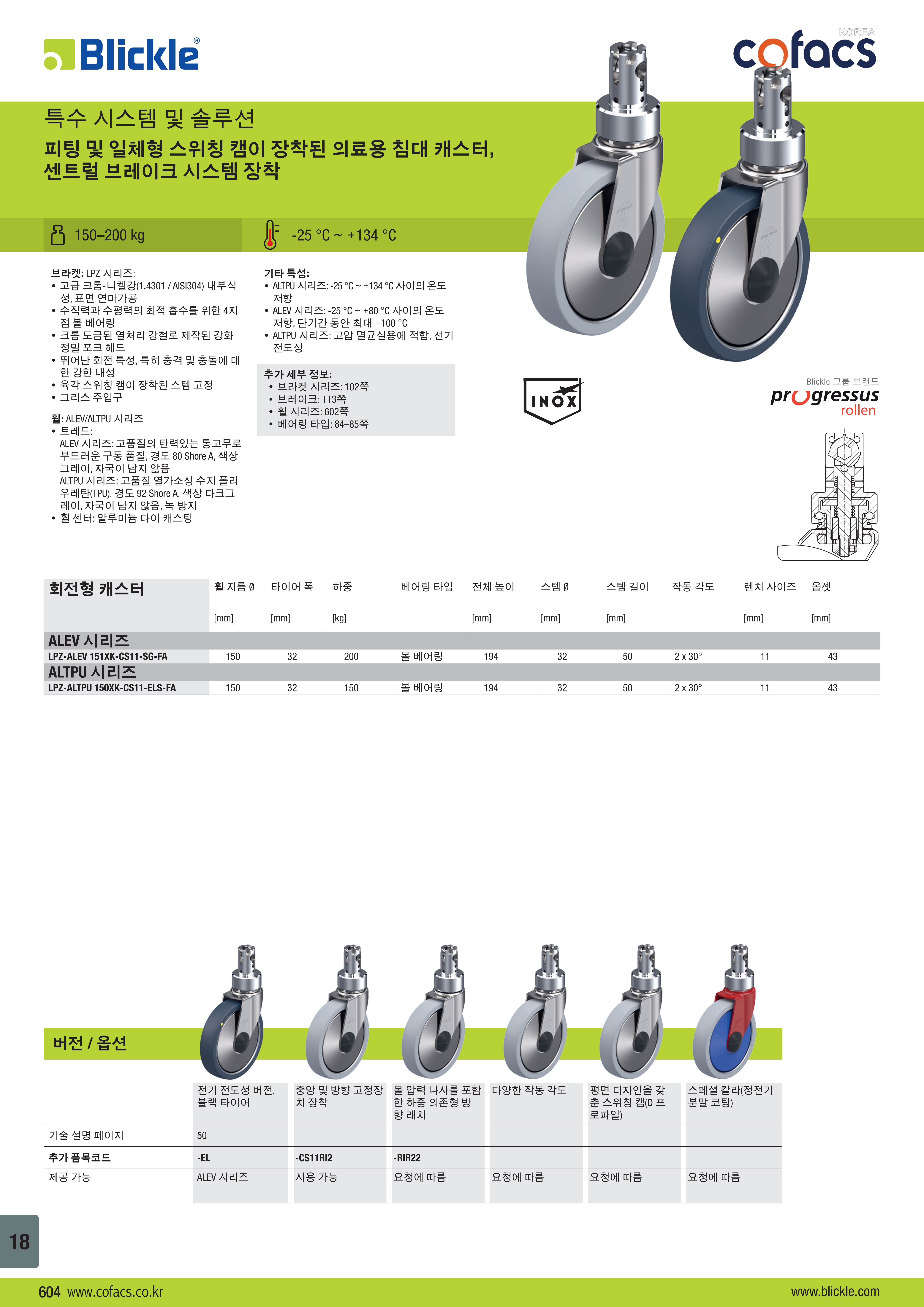 피팅 및 일체형 스위칭 캠이 장착된 의료용 침대 캐스터, 센트럴 브레이크 시스템 장착